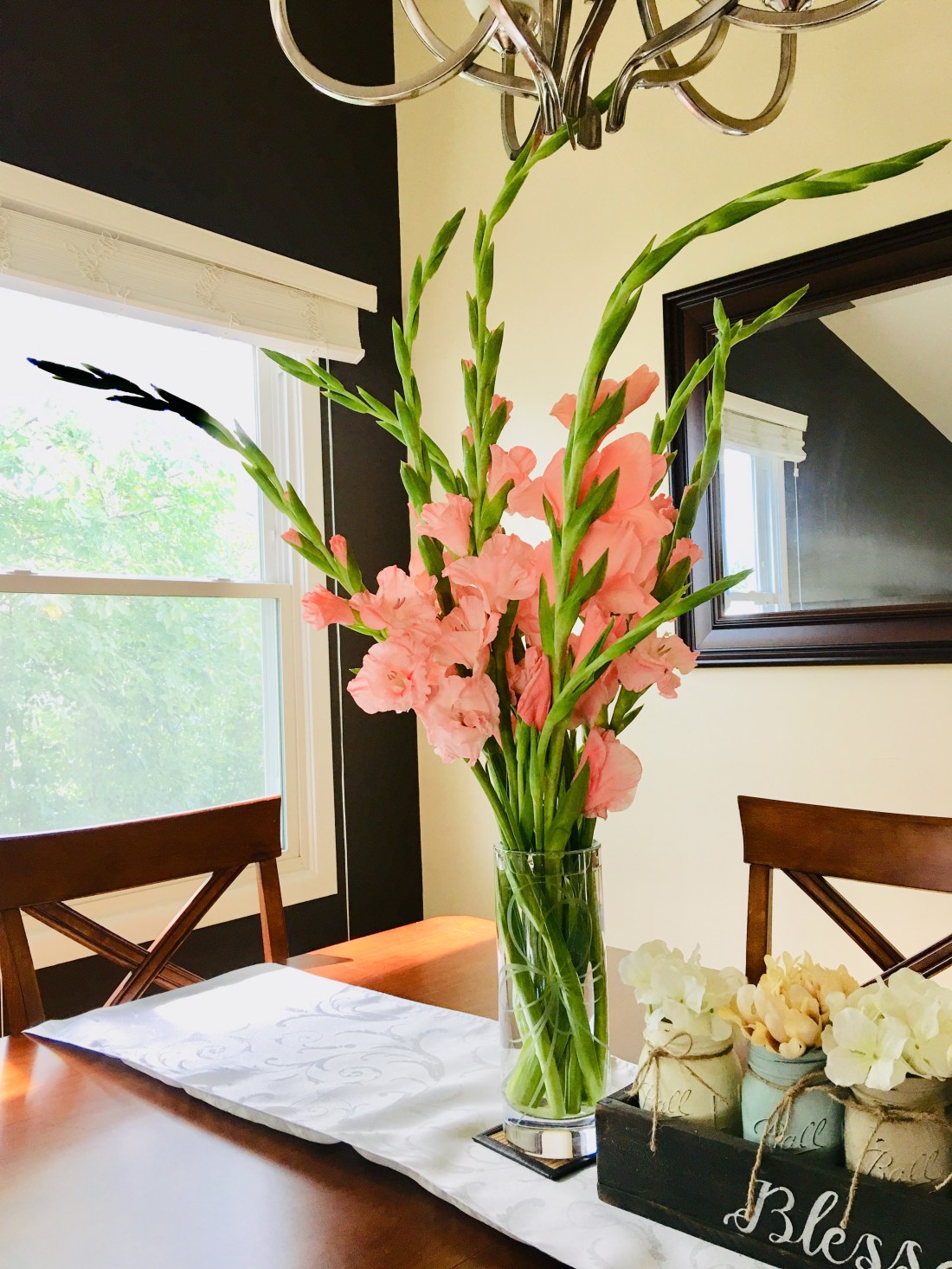 My husband took my daughter to a farmer’s market and she picked out flowers to give to me 🙂 I’m obsessed with the color pink and they are the most gorgeous flowers I have ever owned in my home! They were HUGE, I cut them down to fit in my favorite Kate Spade vase. My dining room table now resembles a table at a wedding reception. Every time I walk into the room, these beautiful flowers make me smile….