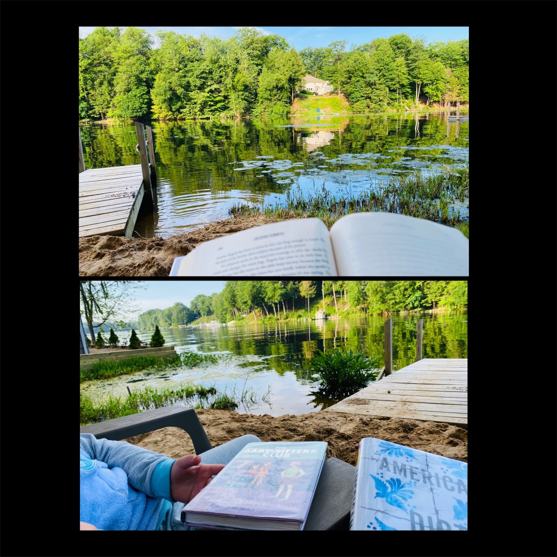 Eventually my son woke up and joined us.  American Dirt for me, Babysitters Club book #2 for my daughter, and dinosaur and Elmo books for my son.
