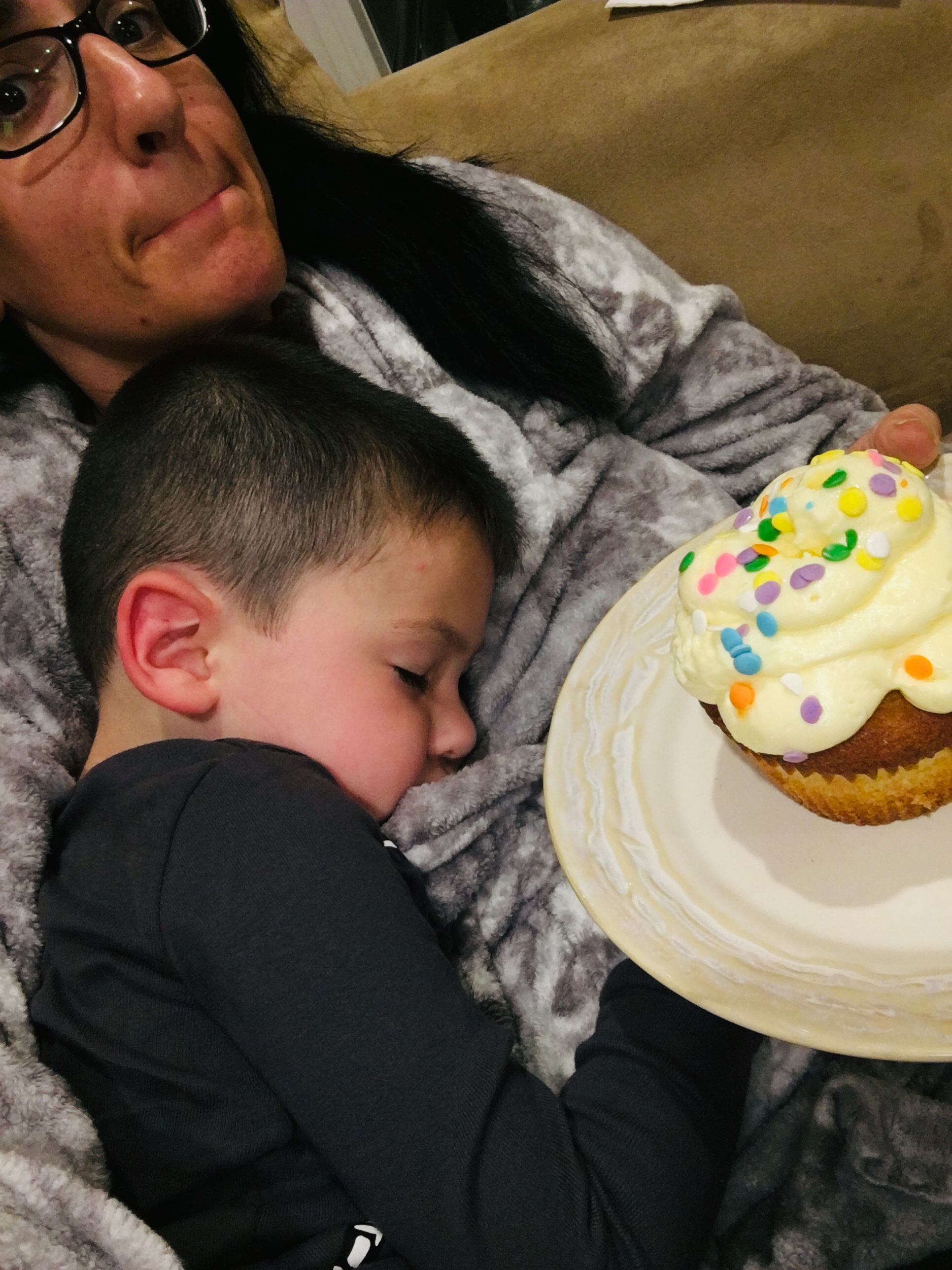 I was so excited to eat my perfect looking blog birthday cupcake but was struggling with how to eat it with my son sound asleep on me. I took this selfie and literally 1 second later…