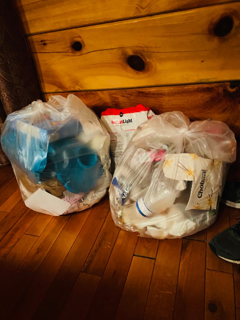 Garbage that we couldn’t take outside because the bear proof garbage cans were locked…and the lock froze!