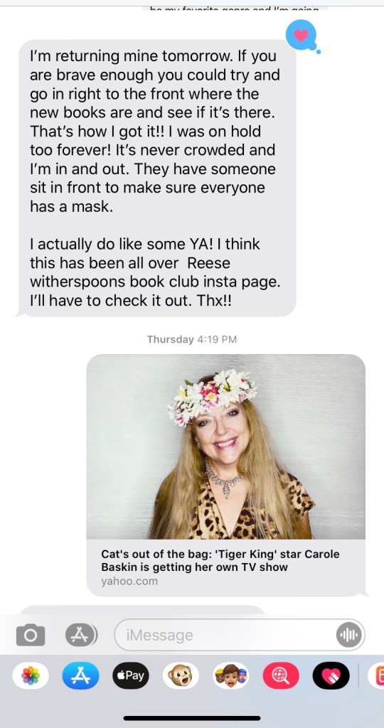 The process of checking out the books today was seemless. The wonderful librarian didn’t even touch my library card, I just held it up for her to scan. When she handed me the books, I touched the opposite end of them from where she was touching. Perfect.